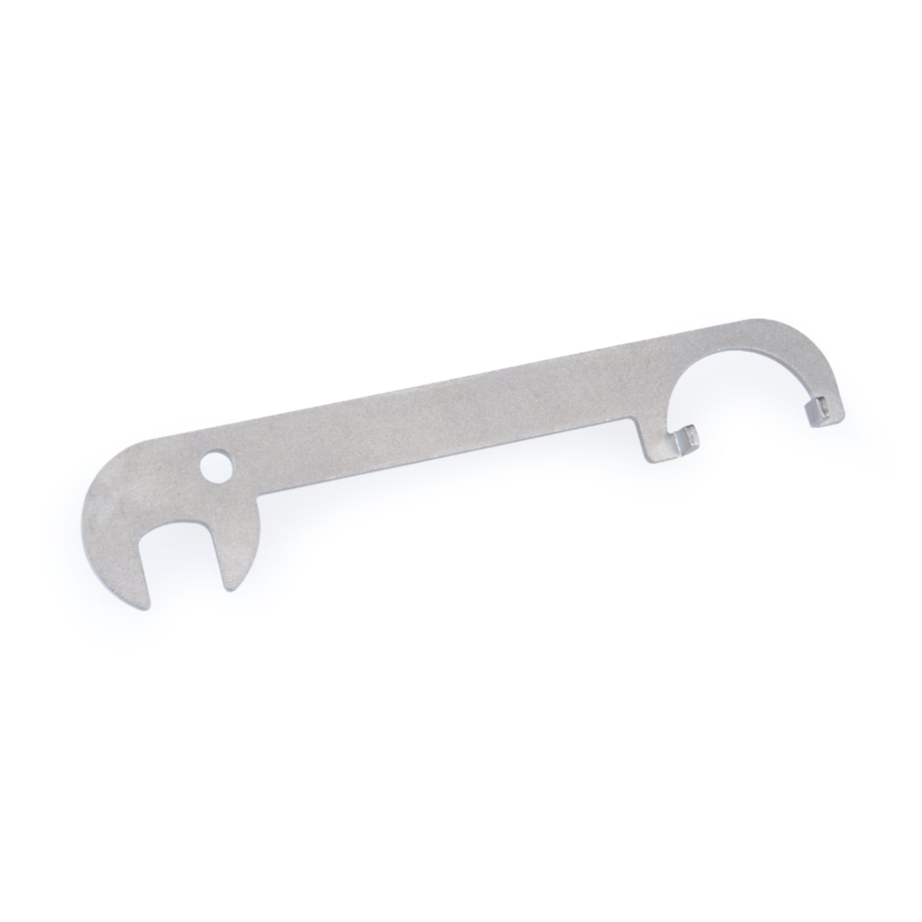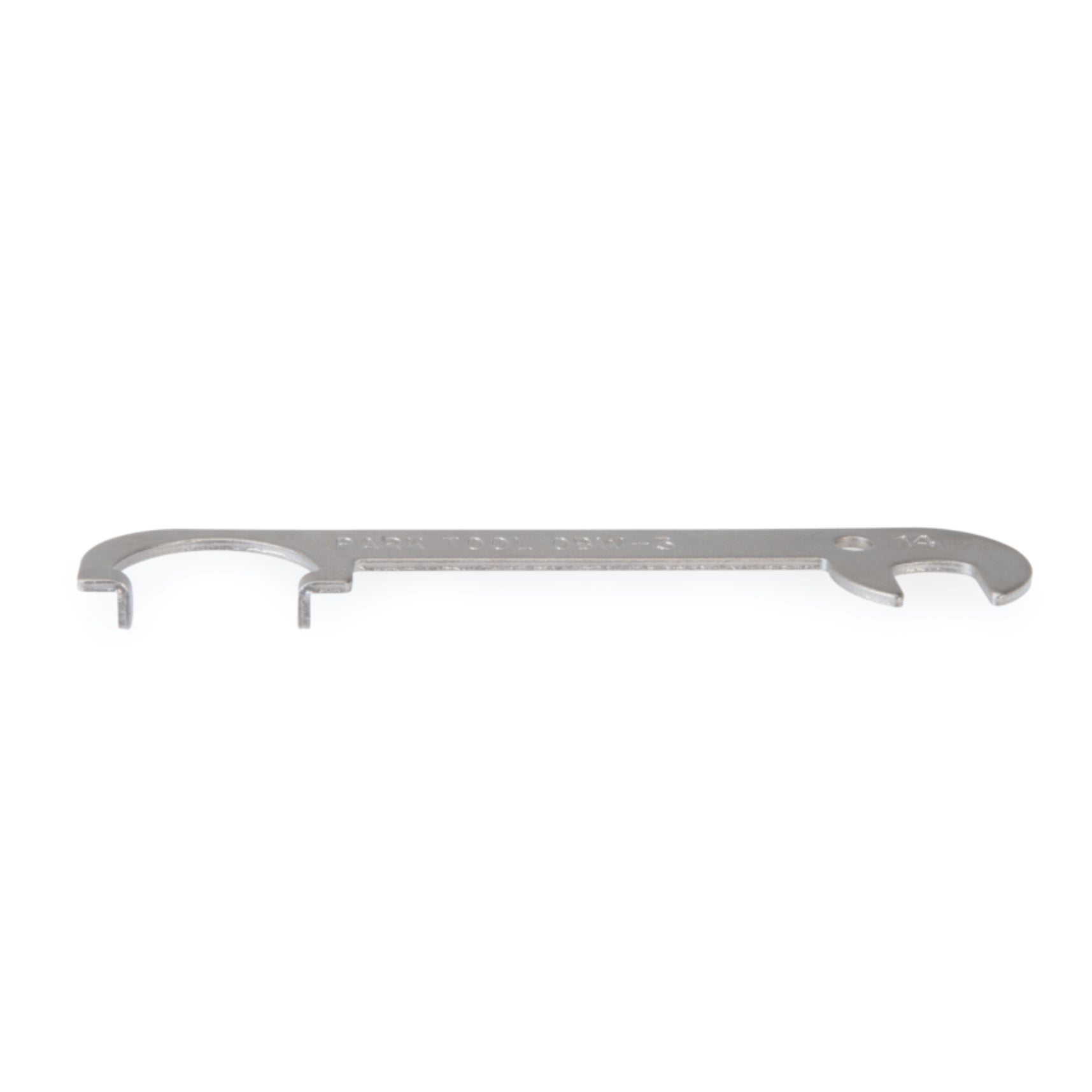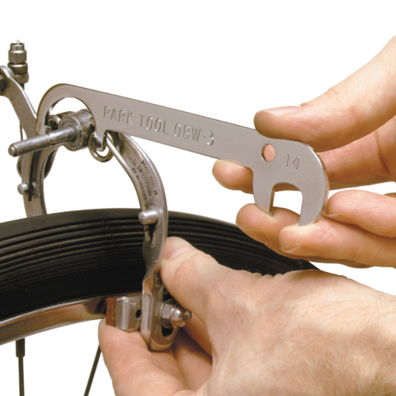 The OBW-3 features a 14 mm open-end wrench and a spring holder tool for engaging the brake tension spring that is accessible on some side-pull brake calipers.